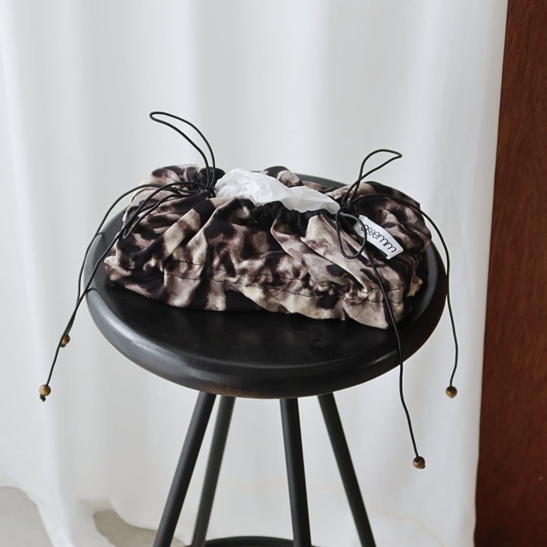 しっとりとしたマーブル柄の生地で仕立てたマルチウェイカバー。ティッシュケースとしてぴったりなサイズで作っていますが、2カ所のドローコードを調節すると鉢カバーや小物入れにもなります。